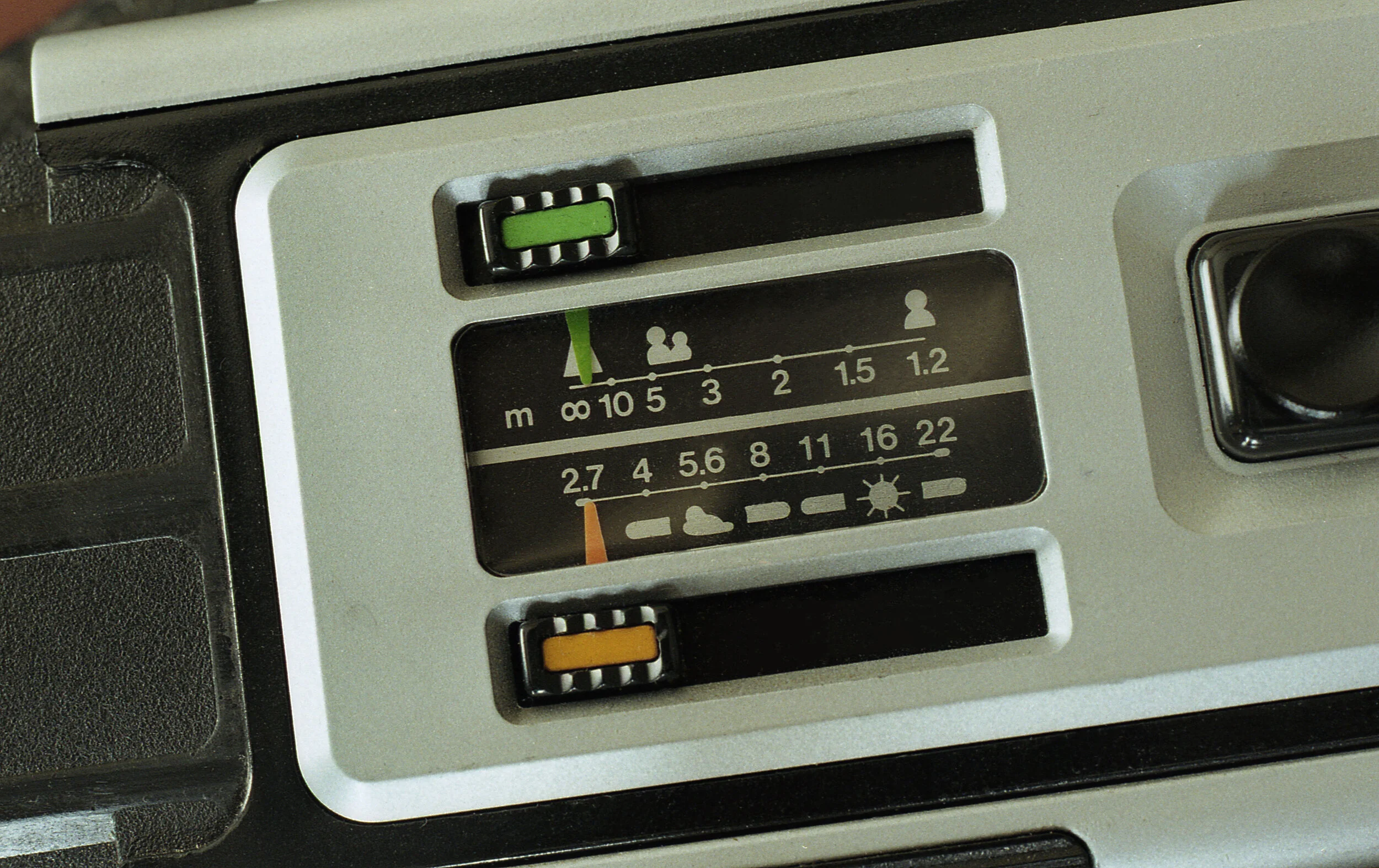To see through the viewfinder, you need to first open the camera. With the camera’s lens facing away from you, if you place your left hand index finger, and thumb on the indentations of the camera’s body, you can pull the camera apart. This action does a few things. Similar to the Rollei A110, the opening and closing of the camera advances the film to the next frame and winds the shutter. Now that the camera is open, you are able to see through the viewfinder and take a picture. The Pocketpak 5000 is a scale focus camera and you are able to see the classic symbols of a mountain, people, and a single person on the top of the viewfinder. Frame lines and a parallax correction area are present as well. In addition, there are three LED lights on the right hand side of the viewfinder. The top is an over exposure warning, the bottom is a slow speed warning, and the middle lets you know that the ND filter is in front of the lens. That’s right, there is a built in ND4 filter that you can slide in at any time.