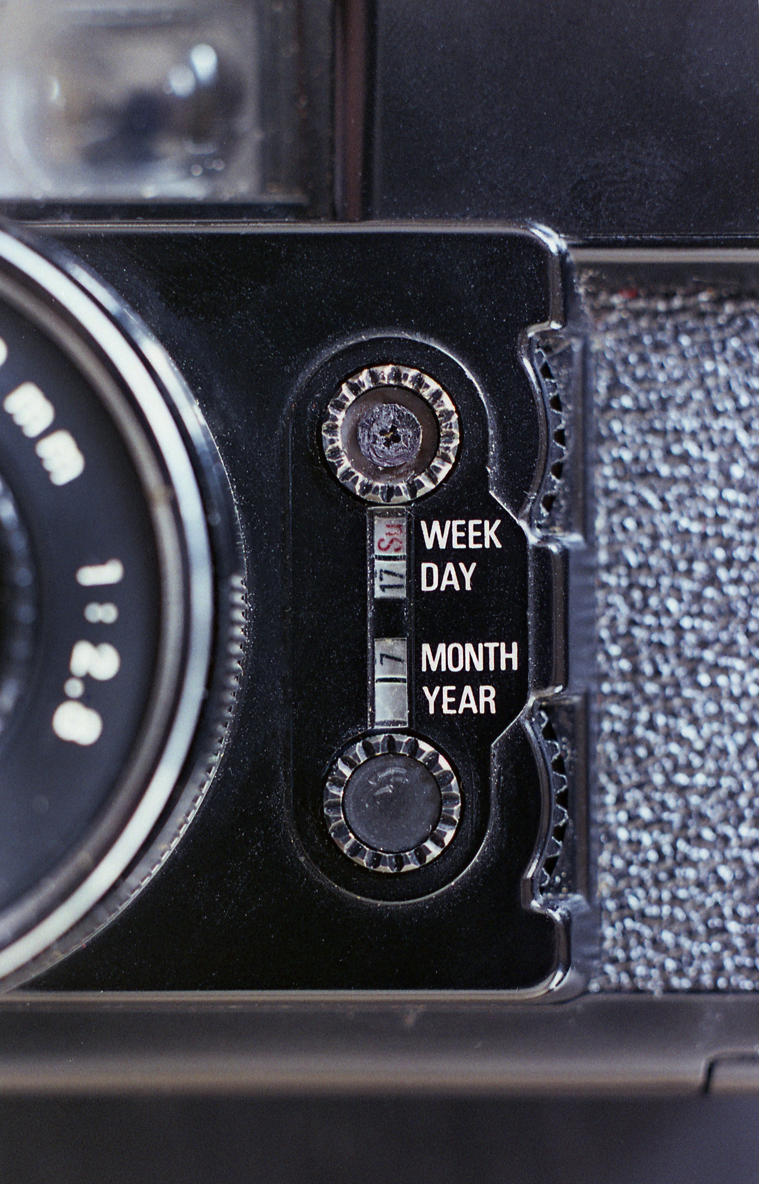 To the right of the lens is the main show of the Yashica Diary, the date function. This is where the camera stands out from the competition as well, being one of the first to feature the day of the week and optional letters in the month setting. Each wheel on the top and sides controls the numbers; on the face is the week and year, and on the sides the day and month. The week goes from Sunday to Saturday, each in their three letter abbreviations and Sunday marked in red, to a blank spot, or the option of Sunday through Friday in a singular Kanji character. Below that is the day going from 1-31 and the option of a blank spot. Moving down we have the month setting, going from 1-12, the letters A-S, and an optional blank spot. Lastly is the year, going from 78 to 91 and an optional blank spot.